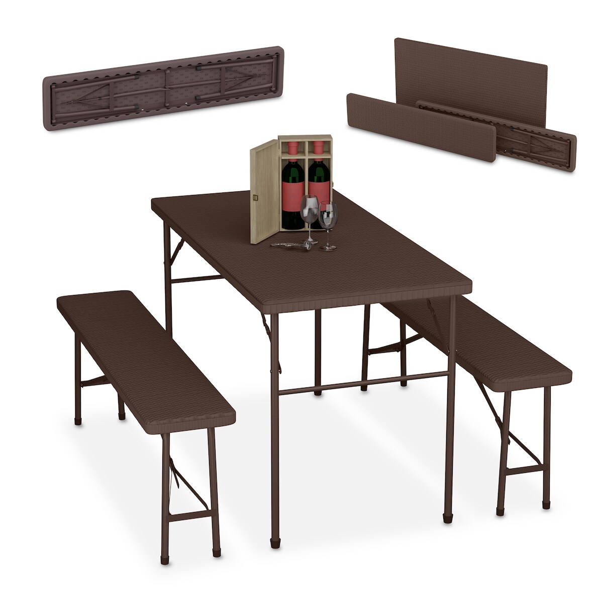 Relaxdays Bierzeltgarnitur klappbar, 3-tlg. Bierbank Set mit großem Tisch, Garten, Festzeltgarnitur, Rattanoptik, braun