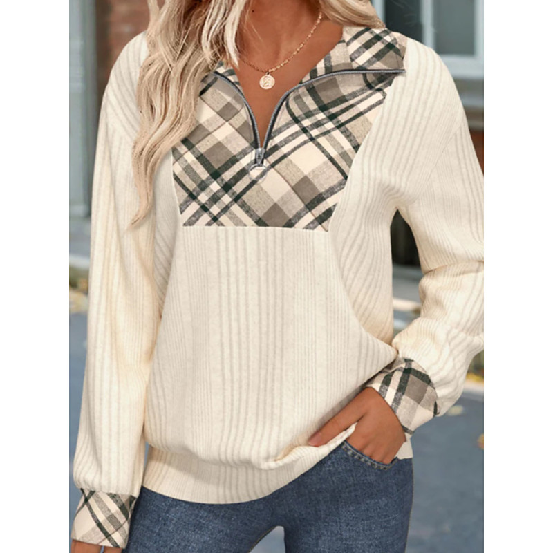 Women's Blouse Geometric Plaid Stylish Casual Long Sleeve V Neck Regular Tops Daily Zipper Print Red Blue Beige Gray Spring Fall Winter