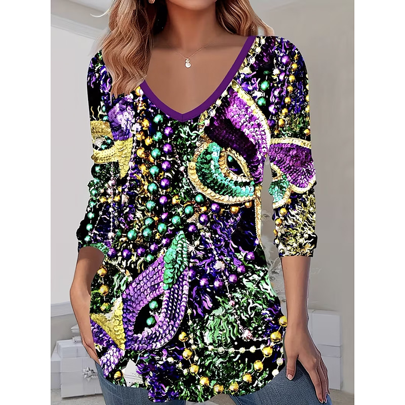 Carnival Women's T Shirt Graphic Abstract Vintage Stylish Casual Long Sleeve V Neck Regular Tops Daily Print Green Spring Fall