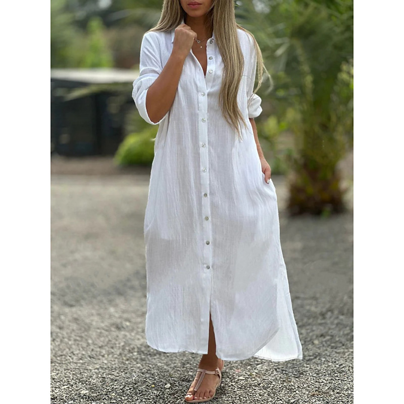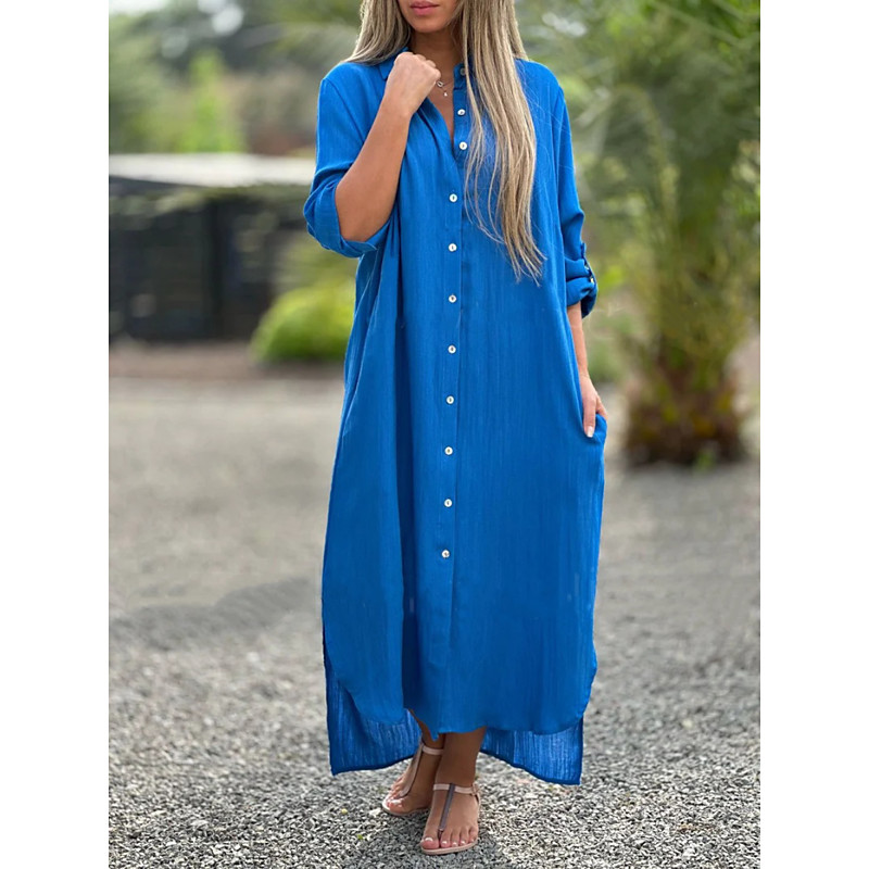 Women's Maxi Dress Shift Dress Casual Daily Loose Fit Plain Long Sleeve Lapel Blue Black White Light Green Spring Fall