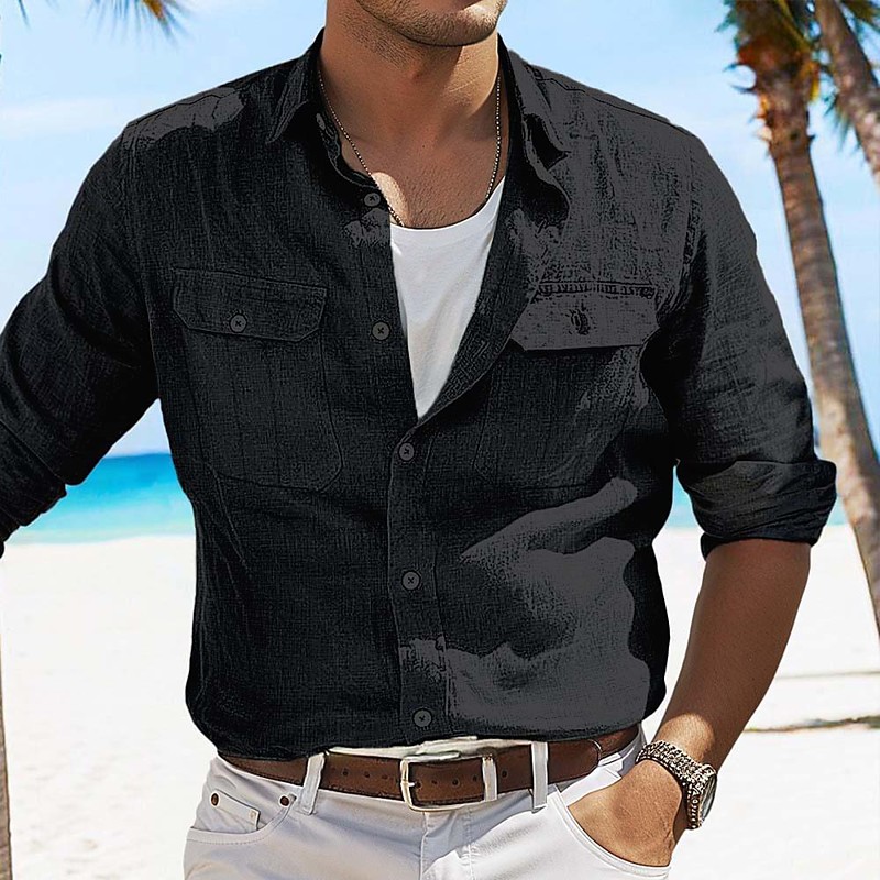 Men's Shirt Linen Shirt Summer Shirt Button Up Shirt Cargo Shirt Plain Casual Daily Black White Blue Khaki Long Sleeve Collar Summer Spring Summer Clothing Apparel Pocket