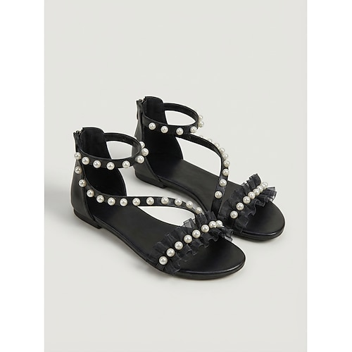 Weiße Damen-Strandhochzeitssandalen – elegante, perlenbesetzte Riemchensandalen mit Rüschentüll für Hochzeiten im Ausland, Zeremonien am Meer und tropische Flitterwochen