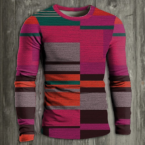 Herren Geometrisch Karomuster 3D T Shirt Langarm T-Shirt 3D-Druck Rundhalsausschnitt Hemd Mode Übertrieben Straße Täglich Blau Rostrot Braun Sommer Frühling Herbst Bekleidung S M L XL XXL XXXL