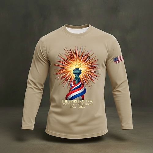 Amerikas 250. Jahrestag Herren Grafik Flagge Fackel T Shirt T-Shirt Langarmshirt Langarm T-Shirt 3D-Druck Rundhalsausschnitt Hemd Mode Täglich Basic Täglich Urlaub Straße Marineblau Khaki Armeegrün