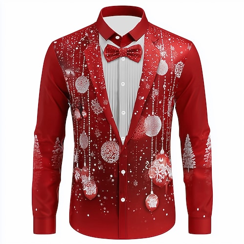 Weihnachten Herren Weihnachtskostüm Smokinghemd mit Anzugkrawatte und Aufdruck Hemd Knopfhemd Langarm Lustig Outdoor Ferien Frühling Herbst Umlegekragen 3D-Druck Hemden mit Kragen Rot 1 Rote