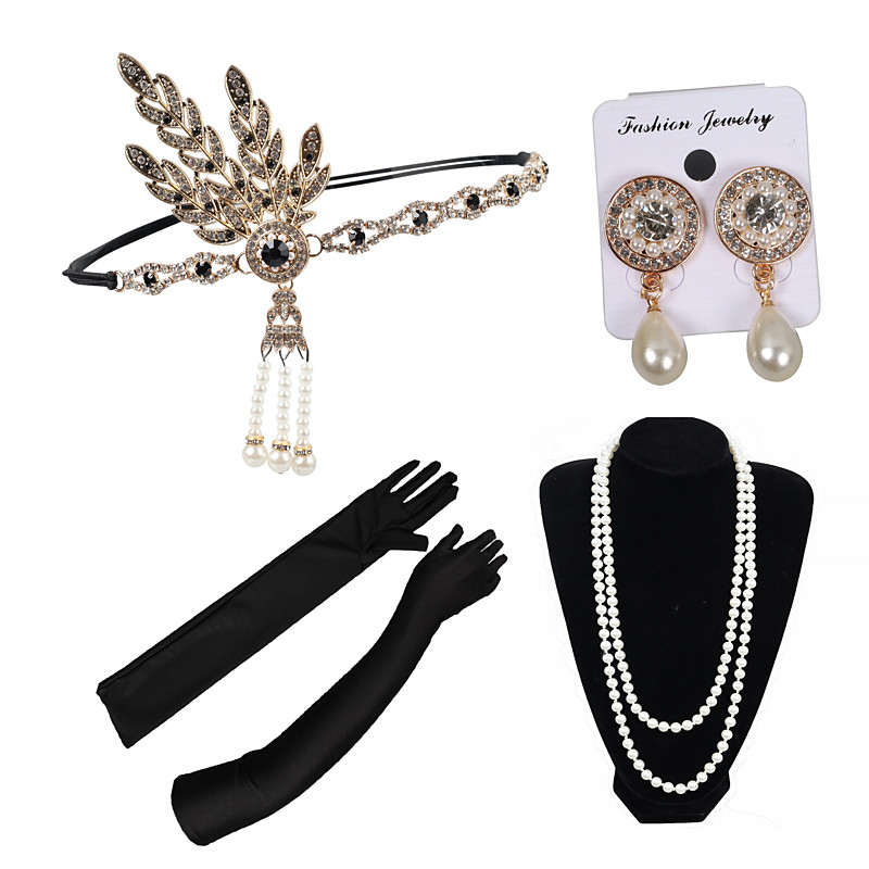 Setsmit Flapper-Kleid, Feder-Stirnband, Handschuhen, Halskette, 4 Stück, Roaring 20s, 1920er-Cocktailkleid, Maskerade, The Great Gatsby, Pailletten, Quaste, Fransen, Kostüme, Damenbekleidung,