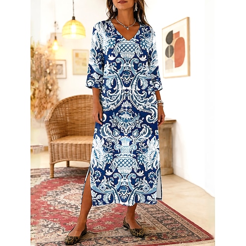 Per donna Abito maxi Abito Boho Abito a Tubino Vestito Estivo Abito da Spiaggia Bohemien Vacanza Etnico Spiaggia Ferie Data Vestibilità comoda Grafico Astratto Manica 3/4 Scollo a V Blu Arancione