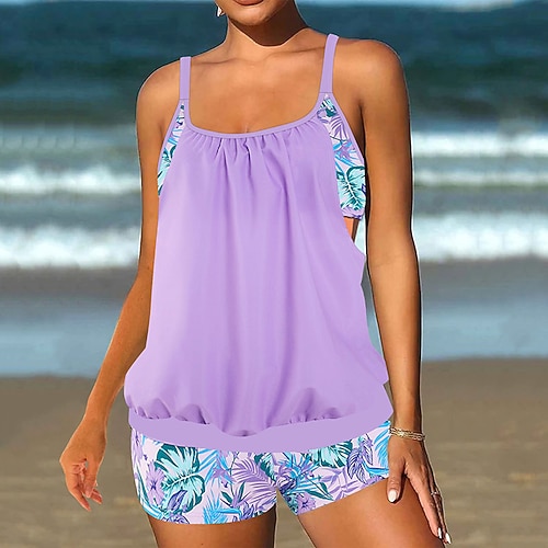 Costume da bagno tankini da donna 2 pezzi arricciato vita alta controllo pancia vita alta Slim senza schiena per vacanze al mare floreale scollo a U senza maniche