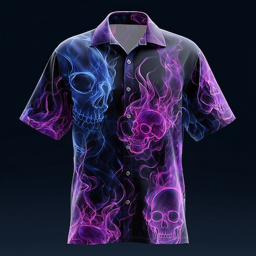 Per uomo Teschio Fiamma Bagliore al neon Camicia Camicia con Bottoni Manica Corta Stile gotico oscuro All'aperto Vacanza Estate Primavera Collo ripiegato Stampa 3D camicie con colletto Nero Blu scuro
