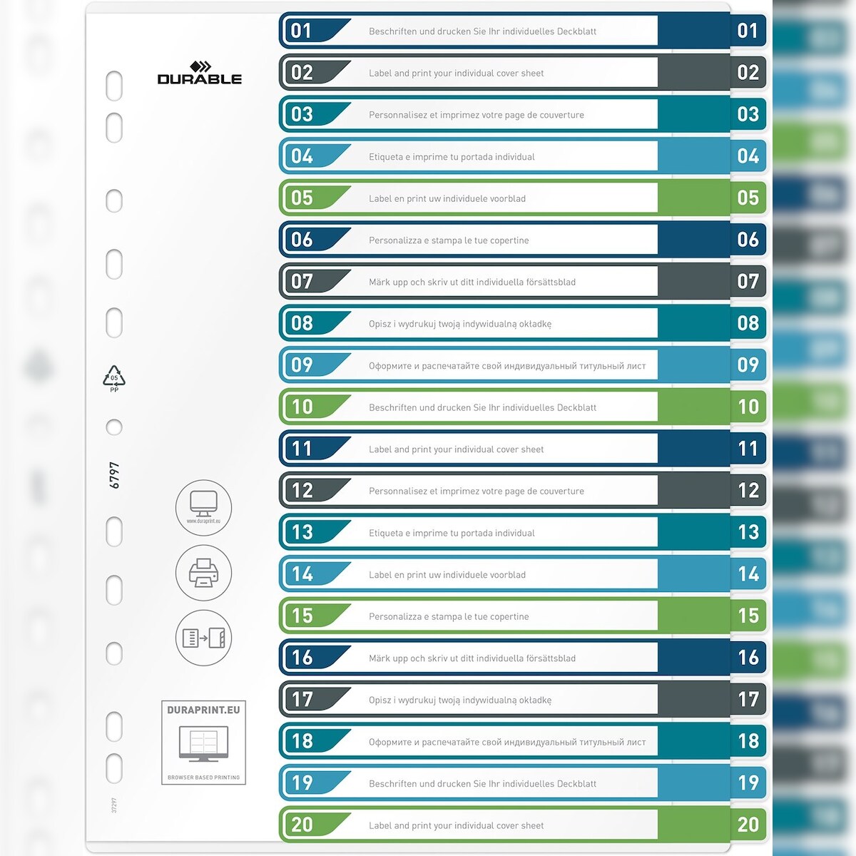Durable Ordnerregister PP 1-20 farbige Taben beschriftbar A4+ hoch 245x305mm Packung mit 5 Stück