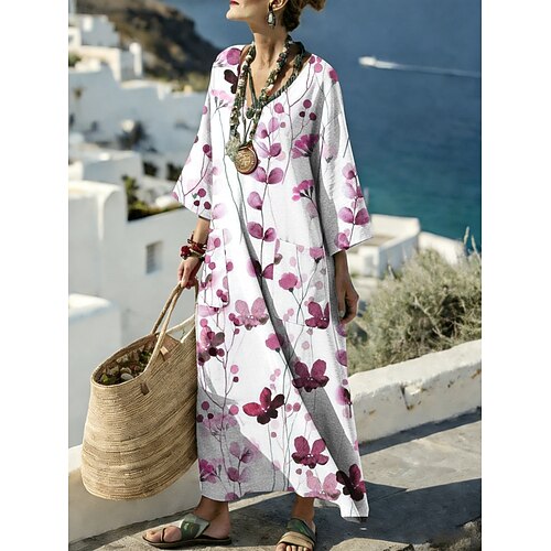 Abito maxi da donna in lino simile Abito a righe casual Quotidiano Vestibilità comoda Floreale Grafico Maniche lunghe Collo a V Blu Rosso Viola Verde Estate Primavera