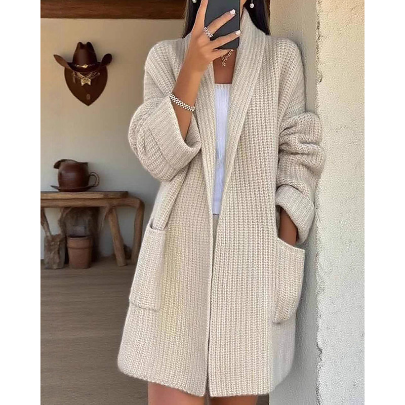 Women's Sweater Cardigan Streetwear Casual Solid Color Shirt Collar Pocket Knitted Long Sleeve Long Tops Knit Daily Holiday Going out Apricot Fall Winter