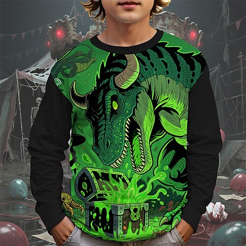 Halloween Jungen 3D Cartoon Dinosaurier T-Shirt Langarm Frühling Herbst Mode Basic Kinder 4-12 Jahre Rundhalsausschnitt Outdoor Lässig Täglich Normale Passform