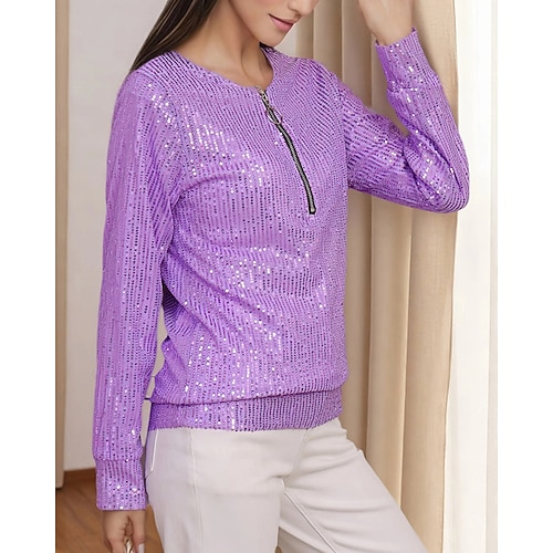 Per donna Maglietta Semplice Moda Moderno Manica Lunga Girocollo Top Regolari Quotidiano Paillettes Zip a un quarto Nero Bianco Giallo Viola Verde Primavera Autunno
