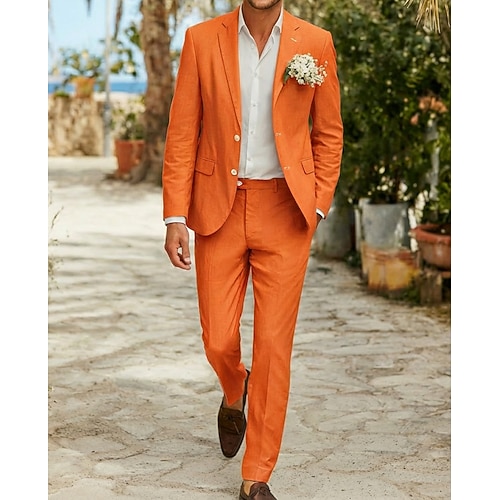 Herren Leinenanzüge Strandhochzeit Lässig Gelb Rote Frühling Sommer Anzug Gekerbtes Revers Mode Täglich Einfarbig Figurbetonter Schnitt 2-teilig Einreihige Zwei-Knopf-Jacke