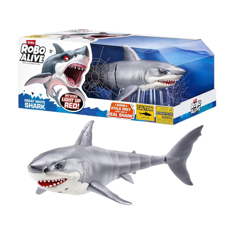ROBO Alive Great White Shark Serie 1 von ZURU, batteriebetriebenes Roboter-Haispielzeug mit Leuchteffekt, Sommerpoolspielzeug, Badespielzeug, Hai