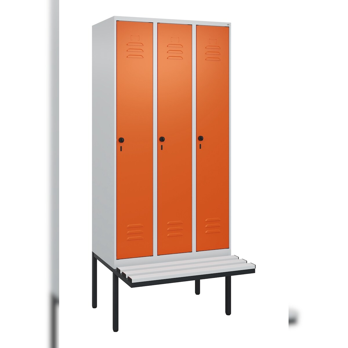 C+P Spind Classic PLUS, Kunststoff schwebende Sitzbank, 3 Abteile, HxBxT 212x90x82cm, Sicherheitsdrehriegel, Hellgrau/Reinorange von PROREGAL
