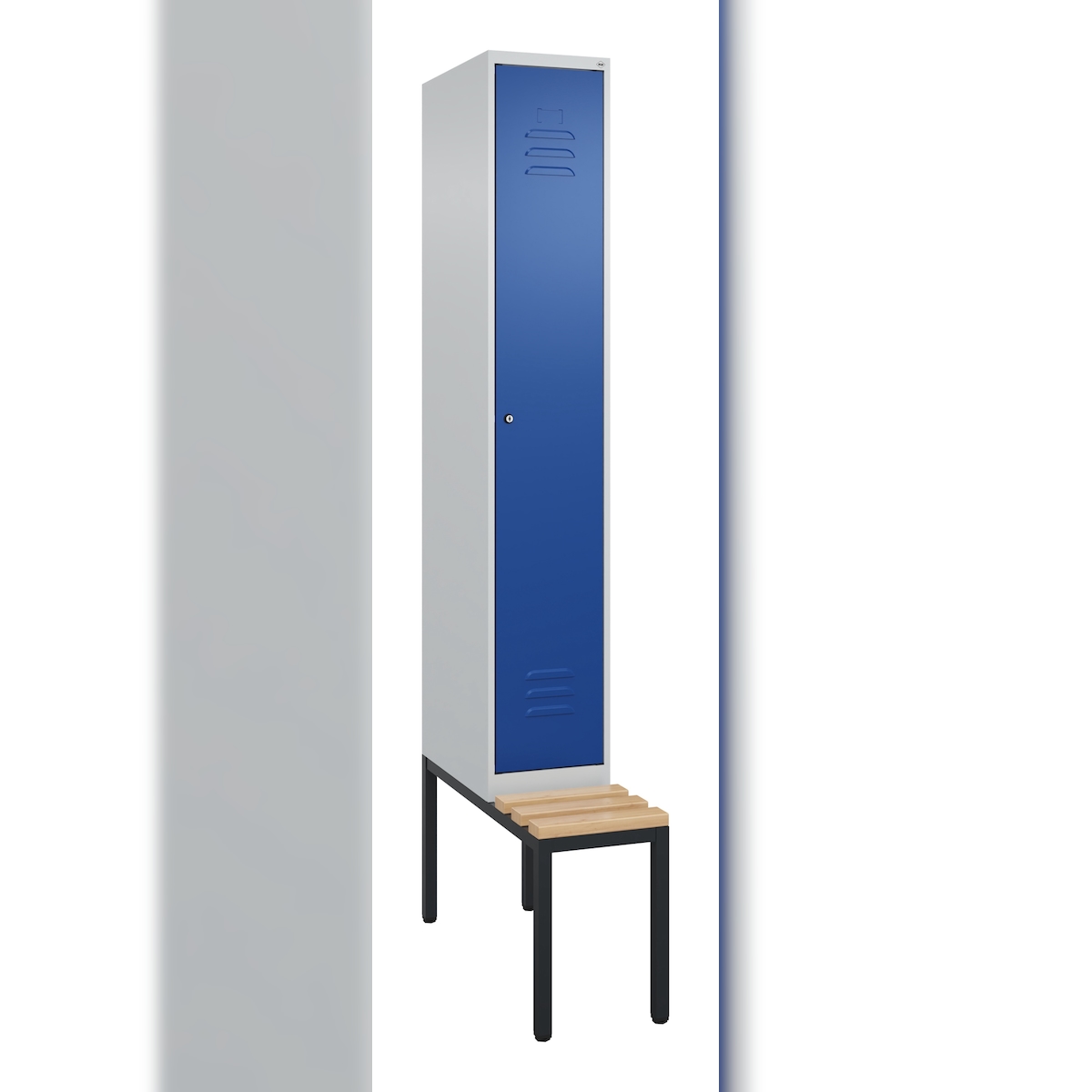 C+P Spind Classic PLUS, Buche untergebaute Sitzbank 1 Abteil, HxBxT 212x30x82cm, Zylinderschloss, Hellgrau/Enzianblau von PROREGAL