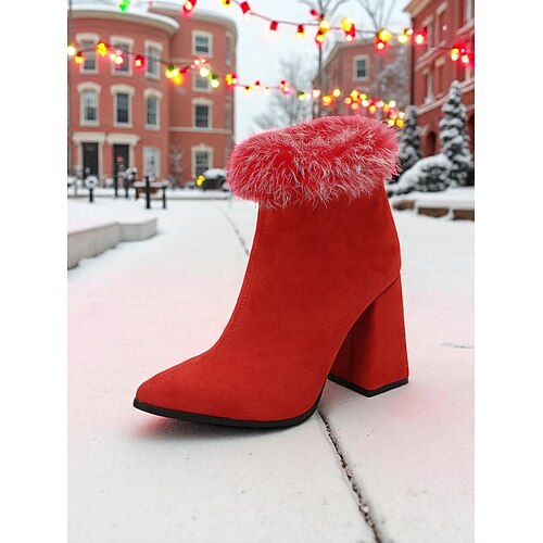 stivaletti da donna in pelle scamosciata rossa con polsino in pelliccia sintetica, tacco a blocco spesso, punta affilata ed elegante, perfetti per l'inverno, le feste di Natale e le occasioni festive