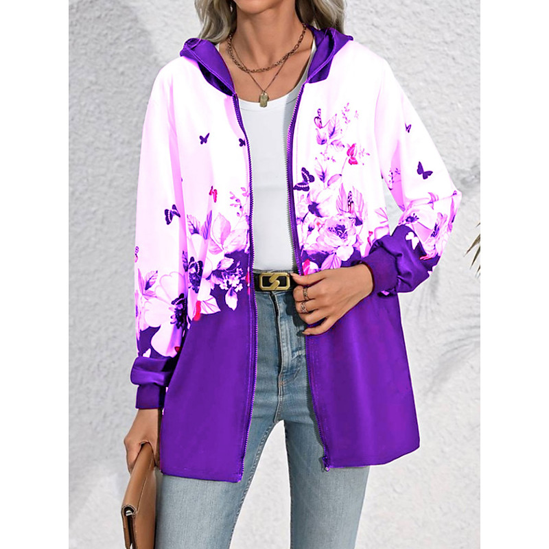 Women's Casual Jacket Hoodie Jacket Comfortable Breathable Zipper Pocket Print Casual Floral Vacation Street Daily Wear Going out Zipper Regular Hooded Regular Fit Long Sleeve Outerwear Black Wine