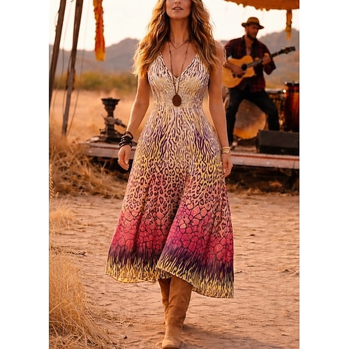 festival musicale abito midi da donna abito estivo boho occidentale abito a trapezio abito estivo abito con spalle scoperte vacanza festa casual festa in spiaggia vacanza grafica leopardo geometrico