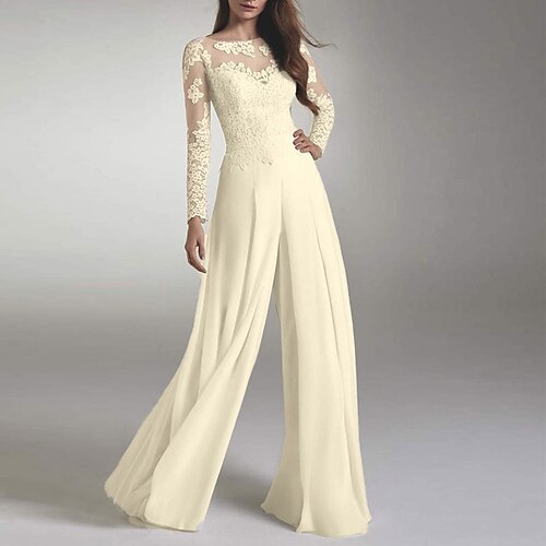 Matrimonio in spiaggia Abiti da cerimonia casual Gonne a tuta Collo illusion Maniche lunghe Lunghezza fino al pavimento Chiffon Abiti da sposa con Applicazioni