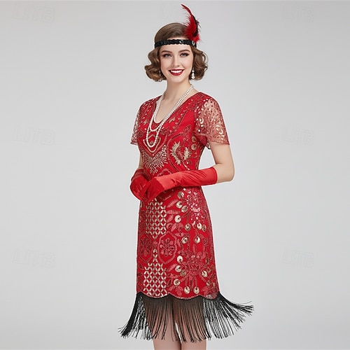 Set Retrò Vintage Anni Ruggenti Anni 1920 Lunghezza al ginocchio Abito Flapper Abiti Abito da cocktail con accessori Maniche corte Il grande Gatsby Invitato al matrimonio Paillettes Frangia con nappe