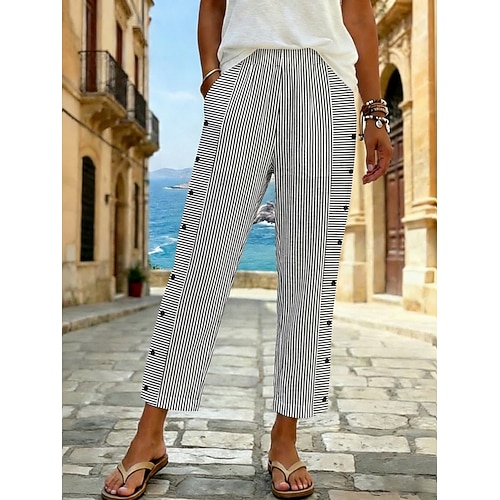 pantaloni da donna in cotone pantaloni affusolati chinos pantaloni cropped moda streetwear lunghezza alla caviglia vita alta a righe tasca elastico in vita comodi morbidi confortevoli per esterni street rice bianco nero rosa verde
