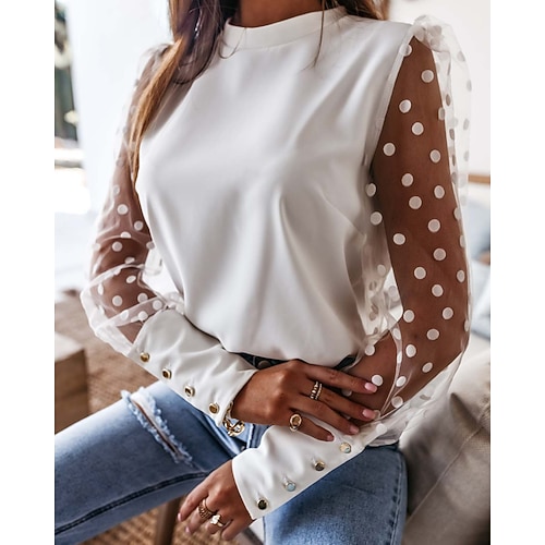 Per donna Blusa A Pois Attivo Elegante Manica Lunga Girocollo Top Regolari Ferie Uscire Patchwork Rete Nero Bianco Estate Primavera