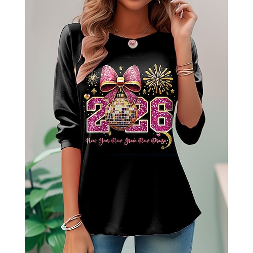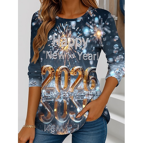 Capodanno Per donna Maglietta Grafico Moda Moderno Manica Lunga Girocollo Top Regolari Quotidiano Weekend Stampato Blu Nero Vino Rosso Blu Reale Autunno Inverno