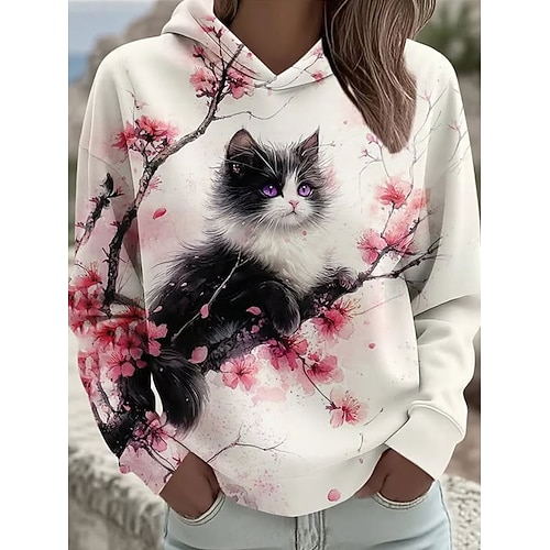 Per donna Felpe Grafico Gatto Casual Manica Lunga Girocollo Top Regolari Casuale Stampato Nero Rosa Rosso Blu Cachi Autunno Inverno