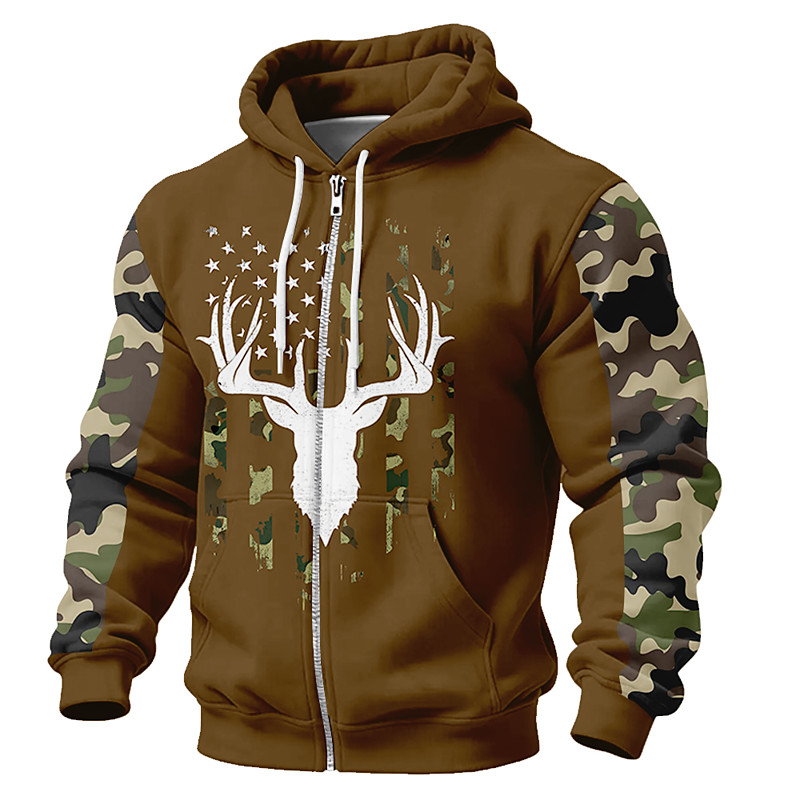 American Flag Deer Silhouette Zip Up Hoodie Camouflage Sleeves Men Tactical Hunting Sweatshirt Patriotic Woodland Camo Outdoor Jacket Clothing Apparel S M L XL XXL XXXL
