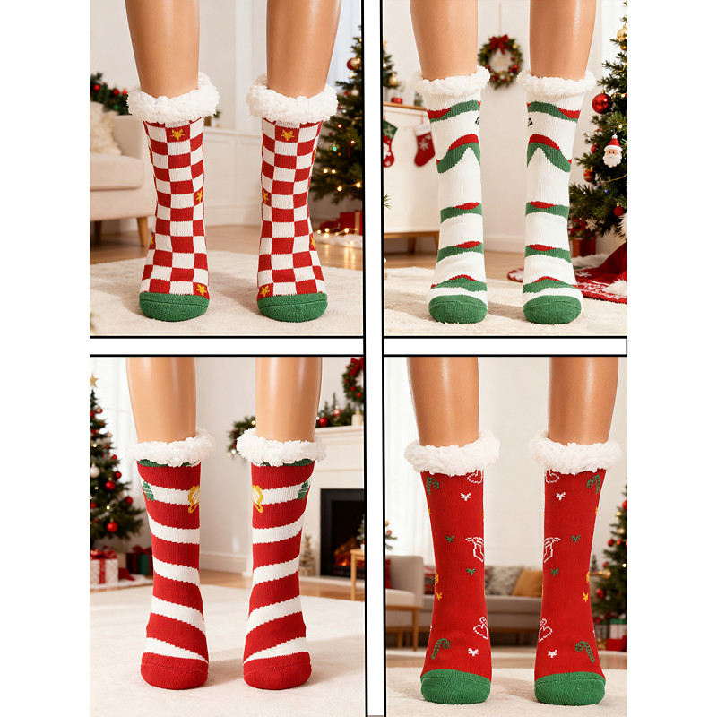 Women's 4 Pairs Christmas Fuzzy Home Socks Set, Cozy Plush Lined Warm Winter Slipper Socks with Santa Holiday Patterns for Gifts Lounge