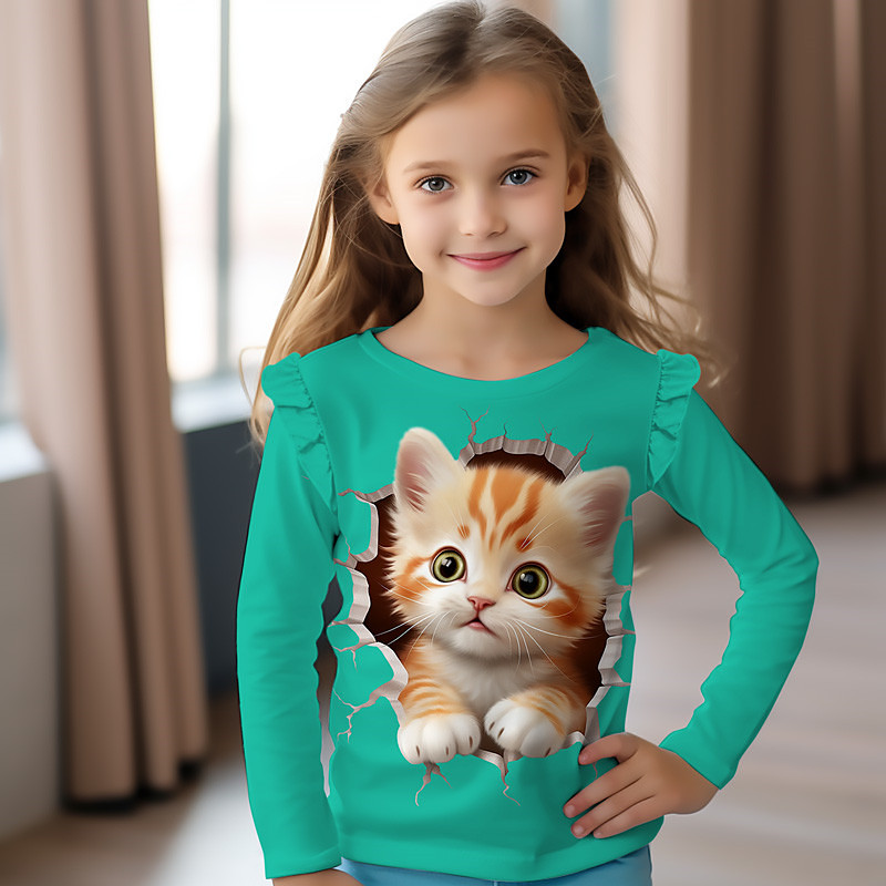 Girls' 3D Graphic Animal Cat T shirt Tee Long Sleeve Spring Fall Fashion Basic Kids 4-12 Years Crew Neck Outdoor Casual Daily Regular Fit