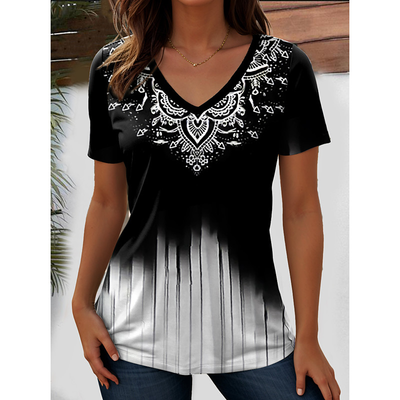 Women's T Shirt Graphic Paisley Bohemia Stylish Casual Short Sleeve V Neck Regular Tops Daily Weekend Beach Wear Print White / Black Black Red Light Brown Purple Summer