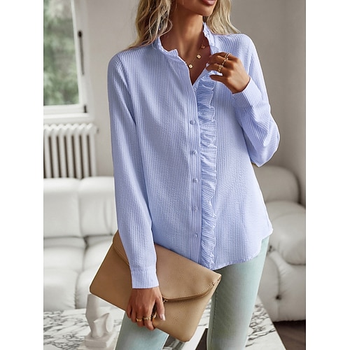 Per donna Blusa Tinta unica Elegante Casual Manica Lunga Collo Alto Top Regolari Quotidiano Volant Bottoni Blu Nero Bianco Rosa Estate Primavera Autunno