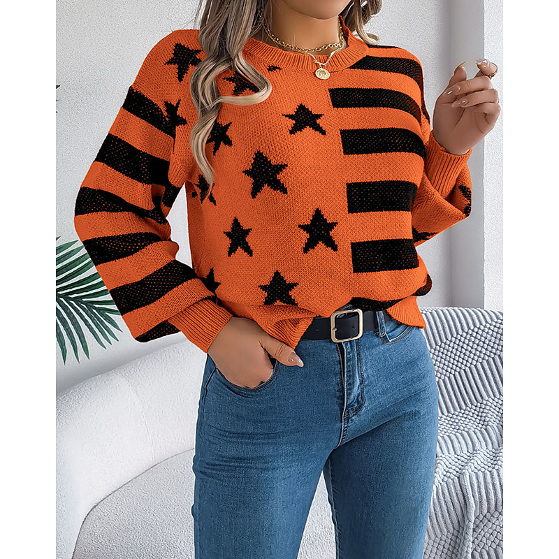 Women's Sweater Pullover Streetwear Casual Graphic Geometric Star Crew Neck Knitted Print Long Sleeve Regular Tops Knit Daily Holiday Going out Orange Khaki Fall Winter