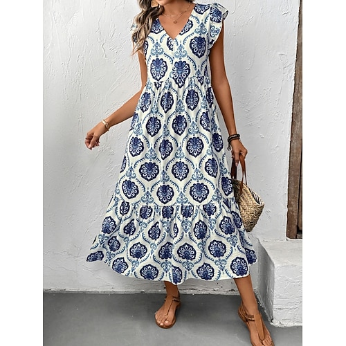 Per donna Abito Midi Abito a trapezio Vacanza Casual All'aperto Uscire Vestibilità comoda Floreale Senza Maniche Scollo a V Blu Verde Estate Primavera