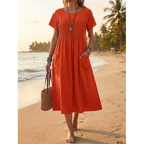 Per donna Abito Midi Finto cotone e lino Vestito a caftano Vestito Casual Elegante Casual Quotidiano Vacanza Data Vestibilità comoda Grafico Manica Corta Girocollo Arancione Estate Primavera