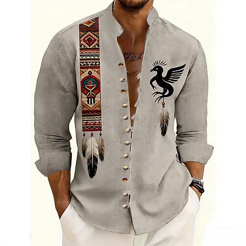 Herren Ethnisch Thunderbird Feder der amerikanischen Ureinwohner Hemd Stehkragenhemd Langarm Vintage-Retro Lässig Urlaub Frühling Herbst Mandarinkragen Stehkragen 3D-Druck Button-Down Leinenähnliches