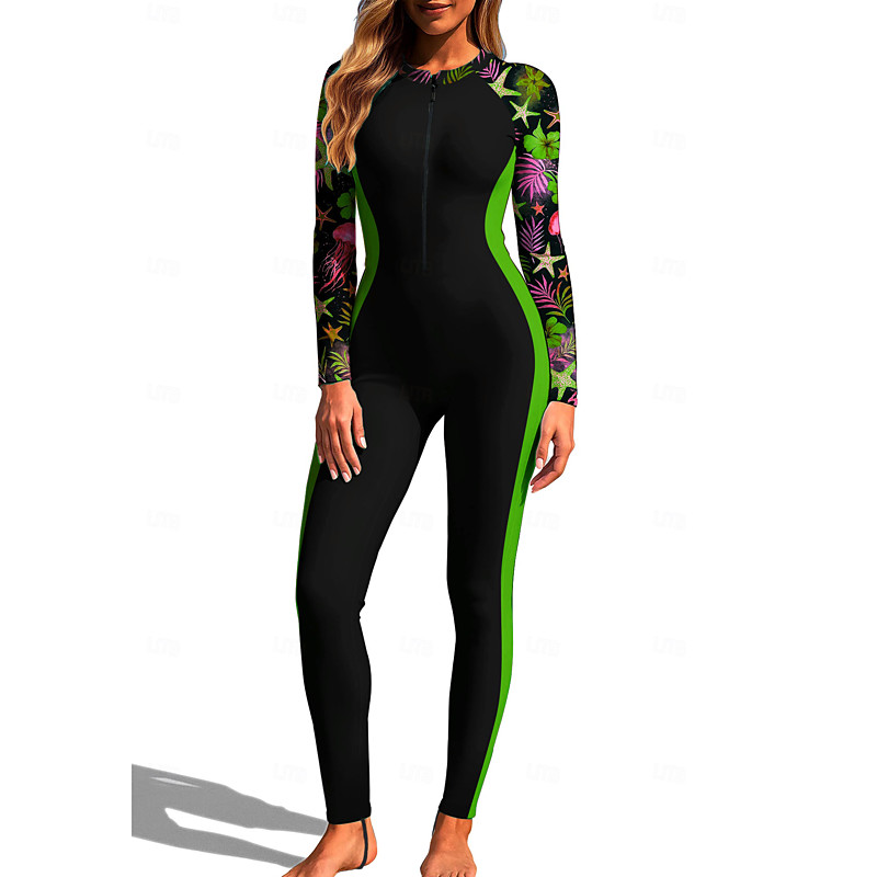 Women's Rash Guard Full Body Rash Guard One Piece Surfing Suit Floral Tropical Color-blocking UV Sun Protection Full Coverage UPF50 Long Sleeve Full Body Swimwear Bodysuit Zip Up with Built in Bra