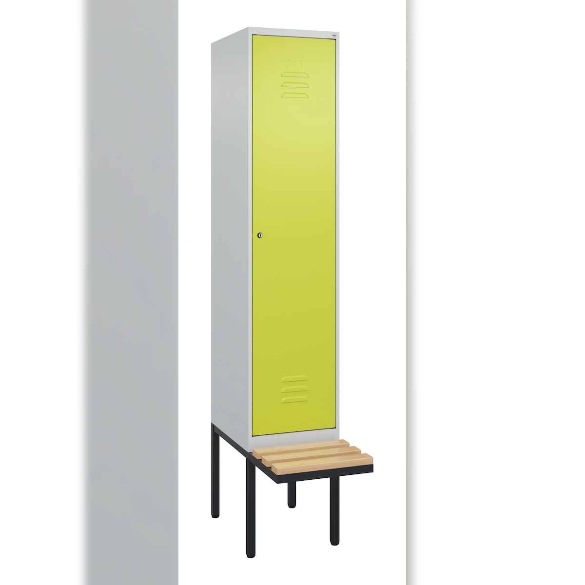 C+P Spind Classic PLUS, schwebender Sitzbank aus Buche 1 Abteil, HxBxT 212x40x82cm, Zylinderschloss, Hellgrau/Clowngrün von PROREGAL