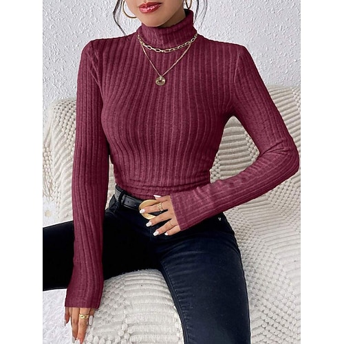 Per donna Felpa Casual Morbido Colore Puro A Coste Dolcevita Lavorato a maglia Manica Lunga Top Regolari Maglia All'aperto Quotidiano Weekend Nero Vino Autunno Inverno