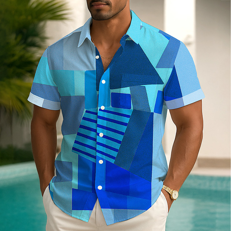 Men's Color Block Grid / Plaid Shirt Summer Shirt Button Up Shirt Short Sleeve Fashion Casual Outdoor Vacation Dailywear Summer Spring Turndown 3D Print Collared Shirts Front One Pocket Blue Green
