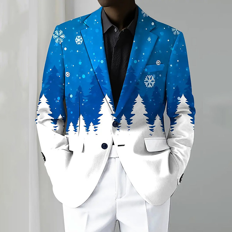 Men's Blazer Coat Christmas Outdoor Casual Casual Daily Fall / Winter 100% Polyester Snowflake 3D Print Buttons Thermal Warm Comfortable Single Breasted Blazer Blue Green