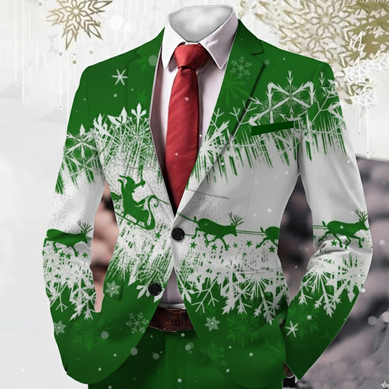 Men's Blazer Coat Christmas Outdoor Casual Casual Daily British Fall / Winter 100% Polyester Elk Snowflake 3D Print Buttons Thermal Warm Comfortable Single Breasted Blazer Red Blue Green