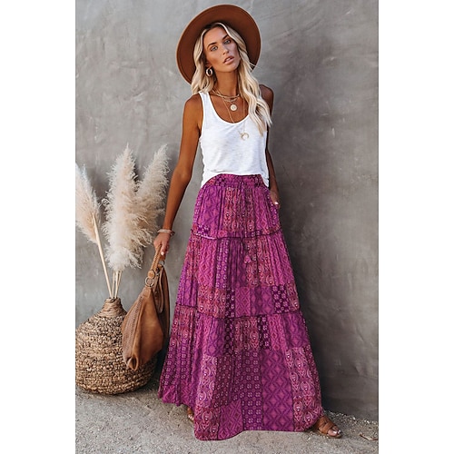 Damenrock Swing Langer Rock Bohemia Maxirock Kordelzug Print Grafik Unifarben Casual Urlaub Frühlingamp;sommer jahrgang boho rot blau lila
