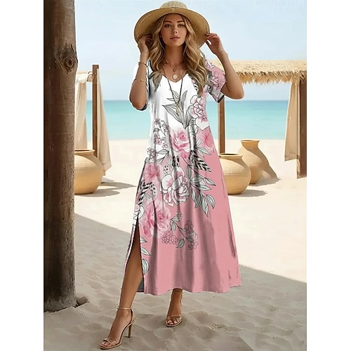 Per donna Abito lungo maxi Vestito Casual Abito a trapezio Abito Stampato Moda Moderno All'aperto Spiaggia Vacanza Vestibilità comoda Floreale Grafico Manica Corta Scollo a V Rosa Estate Primavera