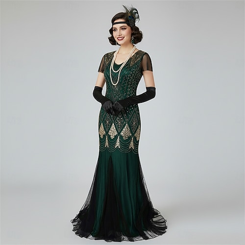Set Retrò Vintage Anni Ruggenti Anni 1920 Lunghezza al pavimento Vestito Abiti Abito da cocktail con accessori Maniche corte Il grande Gatsby Invitato al matrimonio Paillettes Scollo a V Costume Per