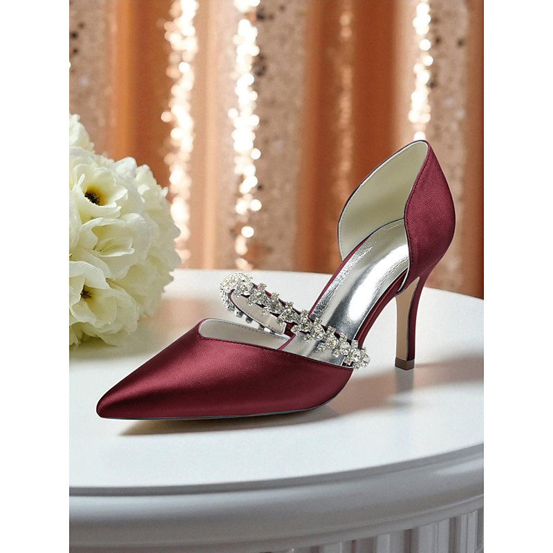 Women's Silver Satin Pointed-Toe Wedding Heels – Rhinestone Embellished Ankle Strap and Elegant Mid Heel